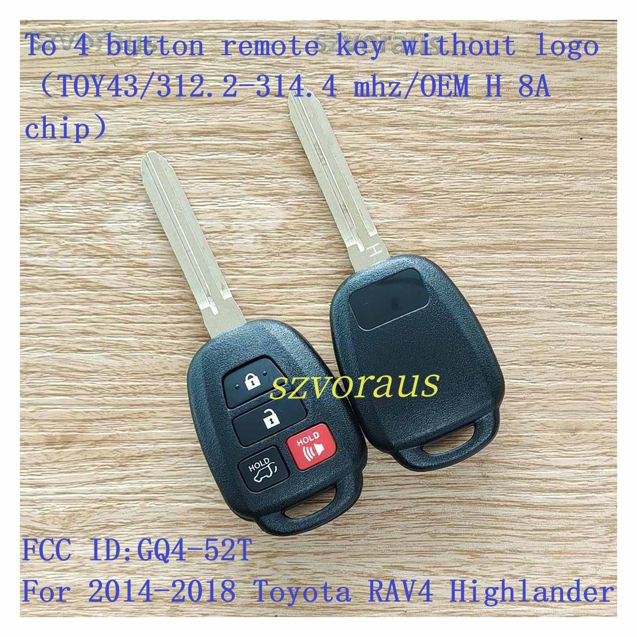 To 4 button remote key without logo (TOY43/312.2-314.4 mhz/OEM H 8A chip)FCC ID:GQ4-52T For 2014-2018 Toyota RAV4 Highlander