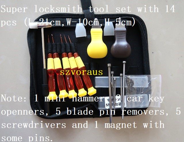 Super locksmith tool set with 14 pcs (L-21cm,W-10cm,H-5cm) Note: 1 mini hammer, 2 car key openners, 5 blade pin removers, 5 screwdrivers and 1 magnet with some pins.