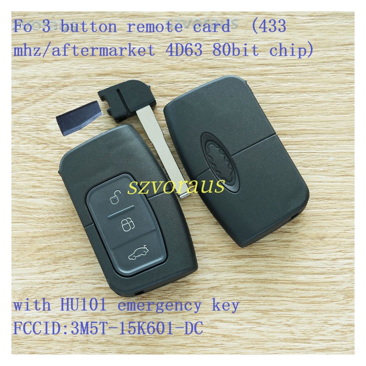 Fo 3 button remote card (433 mhz/aftermarket 4D63 80bit chip) with HU101 emergency key FCCID:3M5T-15K601-DC