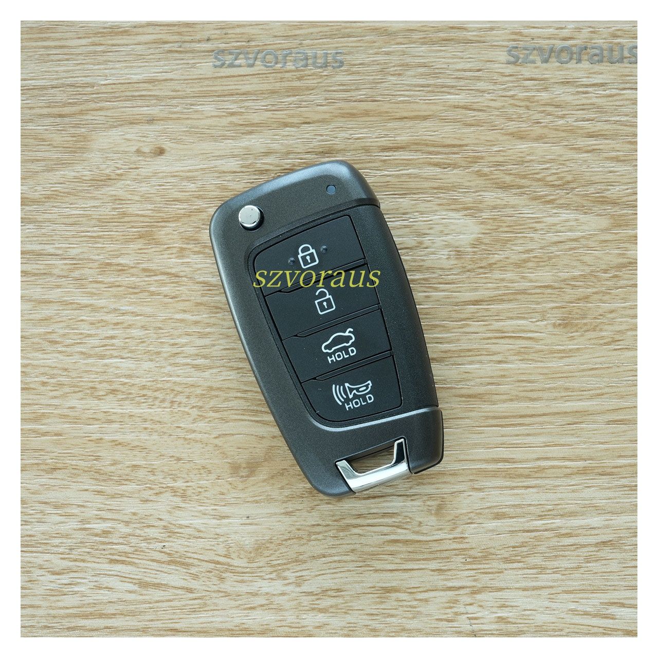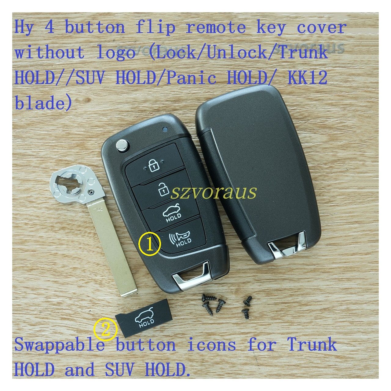 Hy 4 button flip remote key cover without logo (Lock/Unlock/Trunk HOLD//SUV HOLD/Panic HOLD/ KK12 blade) Swappable button icons for Trunk HOLD and SUV HOLD.
