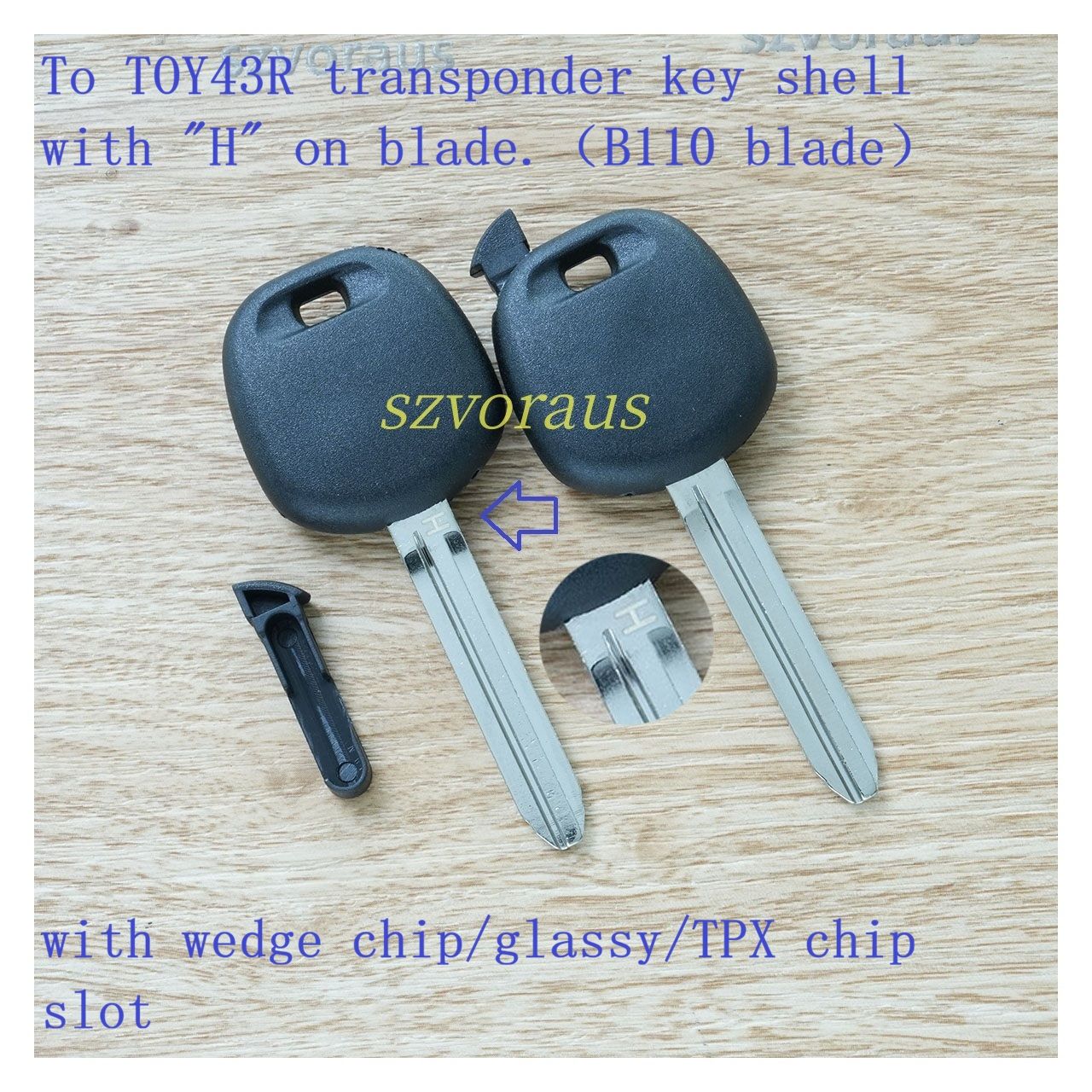 To TOY43R transponder key shell with "H" on blade.(B110 blade)with wedge chip/glassy/TPX chip slot