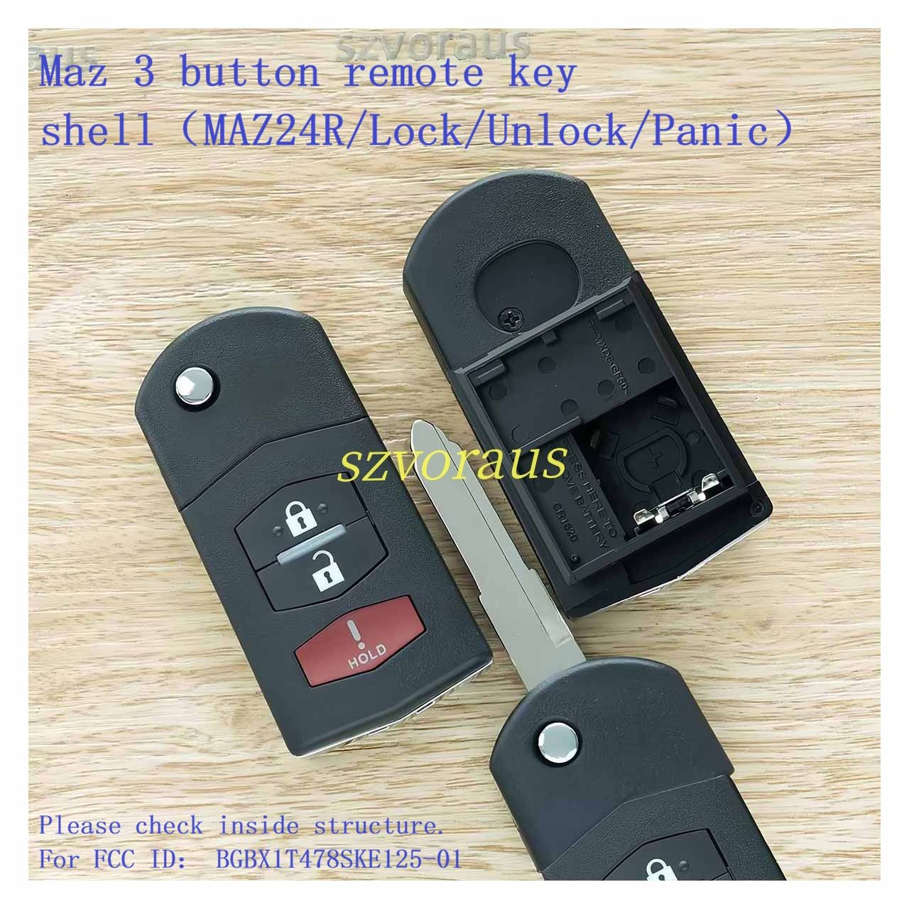 Maz 3 button remote key shell(MAZ24R/Lock/Unlock/Panic) Please check inside structure. For FCC ID: BGBX1T478SKE125-01